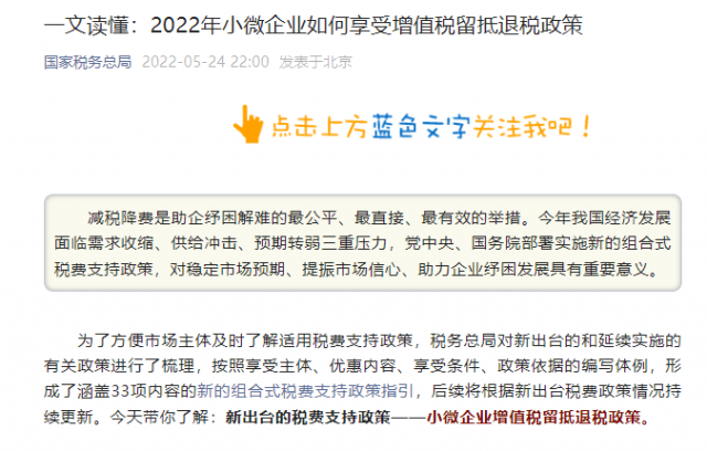 為了方便市場主體及時(shí)了解適用稅費(fèi)支持政策,稅務(wù)總局對(duì)新出臺(tái)的和延續(xù)實(shí)施的有關(guān)政策進(jìn)行了梳理,按照享受主體、優(yōu)惠內(nèi)容、享受條件、政策依據(jù)的編寫體例,形成了涵蓋33項(xiàng)內(nèi)容的新的組合式稅費(fèi)支持政策指引,后續(xù)將根據(jù)新出臺(tái)稅費(fèi)政策情況持續(xù)更新。今天帶你了解:新出臺(tái)的稅費(fèi)支持政策——小微企業(yè)增值稅留抵退稅政策。