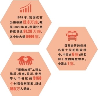 伴隨著經(jīng)濟(jì)發(fā)展和技術(shù)水平的提高,如今,不論是橋梁數(shù)量,還是橋梁技術(shù),中國橋梁的“金字招牌”早已享譽(yù)世界。港珠澳大橋、蘇通大橋、丹昆特大橋、矮寨特大懸索橋……一大批世界級橋梁翻山、越江、跨海,讓無數(shù)天塹變?yōu)橥ㄍ?,也向世界展示著“中國建造”的非凡?shí)力。