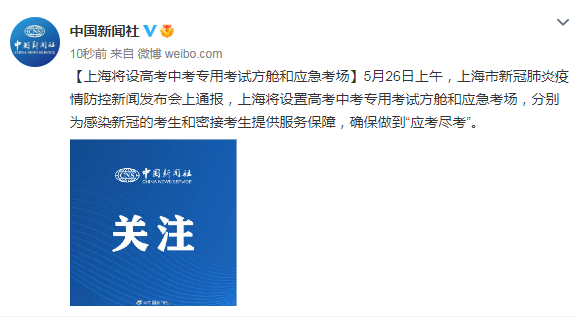 5月26日上午,上海市新冠肺炎疫情防控新聞發(fā)布會(huì)上通報(bào),上海將設(shè)置高考中考專用考試方艙和應(yīng)急考場(chǎng),分別為感染新冠的考生和密接考生提供服務(wù)保障,確保做到“應(yīng)考盡考”。