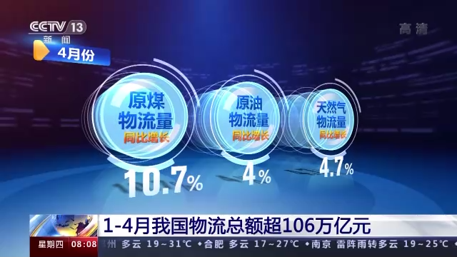 4月份,原煤、原油、天然氣等物流量同比分別增長10.7%、4%和4.7%。