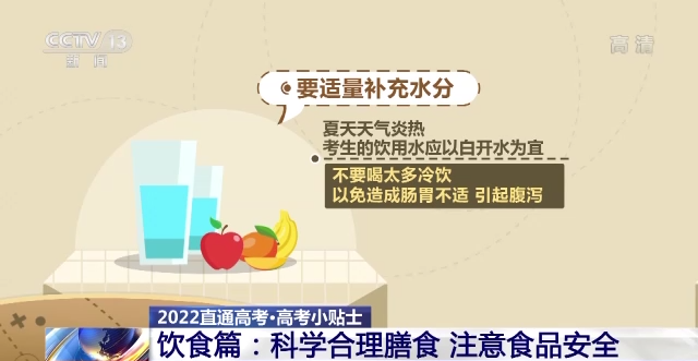 同時,要適量補(bǔ)充水分。夏天天氣炎熱,考生的飲用水應(yīng)以白開水為宜,不要喝太多冷飲,以免造成腸胃不適,引起腹瀉。如遇高溫天氣,建議考生適當(dāng)補(bǔ)充淡鹽水,多吃新鮮蔬果,清淡飲食。