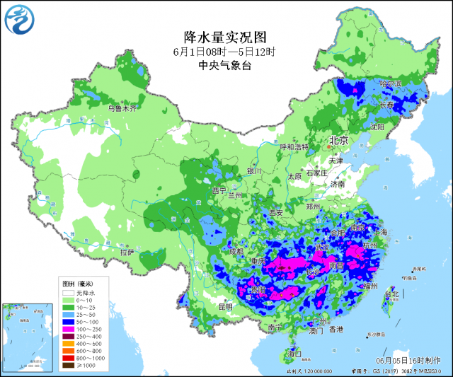據統(tǒng)計,截至6月5日上午,貴州銅仁、湖南懷化和湘西及廣西桂林、柳州、河池等地最大累計降雨量達350~593毫米,貴州、湖南、江西、浙江、廣西、廣東等地個別站點日雨量達到特大暴雨量級(250~326毫米);上述部分地區(qū)出現(xiàn)短時強降水(最大小時降雨量30~70毫米,局地80毫米以上)、雷暴大風等強對流天氣。