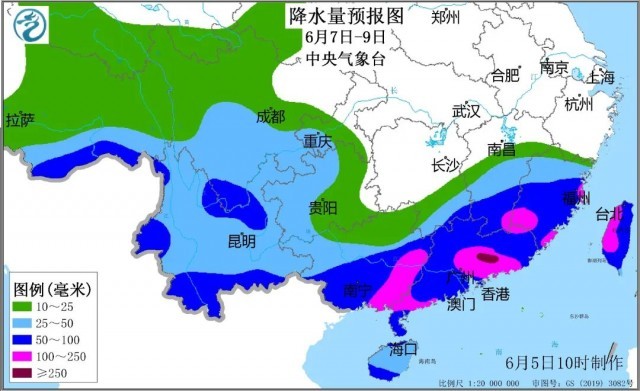 7日至9日,湖南南部、江西中南部、福建、廣西、廣東、海南、臺灣及四川中南部、云南、貴州西部等地部分地區(qū)將有大雨或暴雨,局地大暴雨。廣西東部、廣東西南部和中東部、福建西南部和東部沿海、臺灣西部等地部分地區(qū)降雨量可達100~180毫米,局地200~300毫米;上述地區(qū)還將伴有短時強降水(最大小時降雨量30~50毫米、局地70毫米以上)、雷暴大風等強對流天氣。