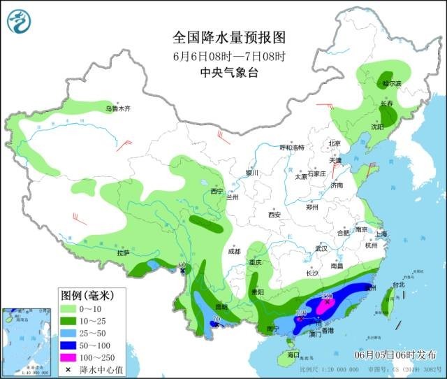 預計6日起,南方地區(qū)主雨帶將階段性南壓,強降雨主要位于江南南部和華南等地;6日,廣西東部、廣東、江西南部、福建中南部、云南南部等地部分地區(qū)有大到暴雨,局地大暴雨(100~220毫米)。
