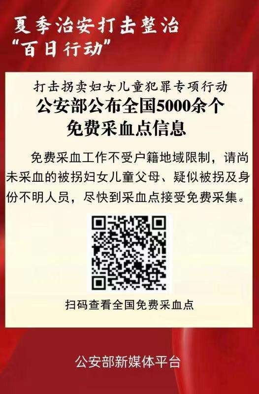 公安部公布全國(guó)5000余個(gè)免費(fèi)采血點(diǎn)信息 助力被拐家庭早日實(shí)現(xiàn)團(tuán)圓 免費(fèi)采血工作不受戶籍地域限制
