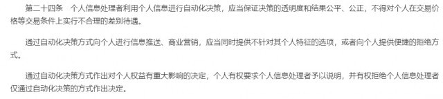 《中華人民共和國個人信息保護(hù)法》第24條明確規(guī)定了用戶對自動化決策的拒絕權(quán),即“通過自動化決策方式向個人進(jìn)行信息推送、商業(yè)營銷,應(yīng)當(dāng)同時提供不針對其個人特征的選項(xiàng),或者向個人提供便捷的拒絕方式”。