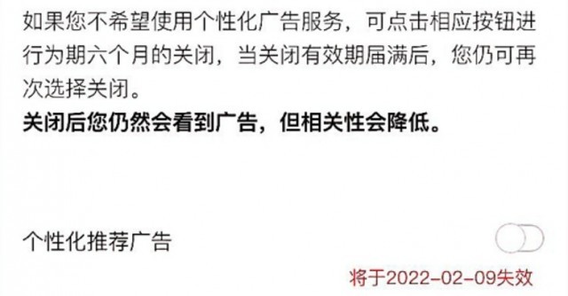警惕用戶這種拒絕權(quán)流于形式,需要平臺自覺維護(hù)。記者通過對比發(fā)現(xiàn),在其他平臺個性化廣告設(shè)置端口,明顯提示“你可以開啟或關(guān)閉服務(wù),或管理廣告興趣標(biāo)簽。廣告總數(shù)不會因此變化?!币簿鸵馕吨鴮⑦x擇或拒絕權(quán)交到了用戶手中,雖然關(guān)閉后還是會接收到隨機(jī)推送的廣告,但這些廣告并非是針對用戶個人興趣點(diǎn)“計算”出來的。