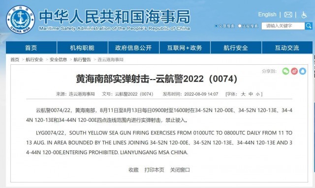 江蘇連云港海事局日前發(fā)布航行警告,今起(8月11日)至13日每日9時(shí)至16時(shí)在黃海南部海域進(jìn)行實(shí)彈射擊,禁止駛?cè)搿?/p>