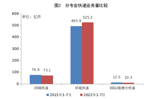 1-7月,全國快遞服務(wù)企業(yè)業(yè)務(wù)量累計(jì)完成608.6億件,同比增長4.3%;業(yè)務(wù)收入累計(jì)完成5880.4億元,同比增長3.7%。其中,同城業(yè)務(wù)量累計(jì)完成73.1億件,同比下降4.9%;異地業(yè)務(wù)量累計(jì)完成525.2億件,同比增長6.3%;國際/港澳臺業(yè)務(wù)量累計(jì)完成10.3億件,同比下降17.8%。