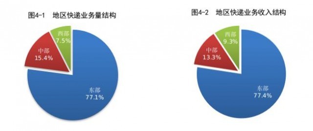 1-7月,東、中、西部地區(qū)快遞業(yè)務(wù)量比重分別為77.1%、15.4%和7.5%,業(yè)務(wù)收入比重分別為77.4%、13.3%和9.3%。與去年同期相比,東部地區(qū)快遞業(yè)務(wù)量比重下降1.5個百分點(diǎn),快遞業(yè)務(wù)收入比重下降1.1個百分點(diǎn);中部地區(qū)快遞業(yè)務(wù)量比重上升1.2個百分點(diǎn),快遞業(yè)務(wù)收入比重上升0.6個百分點(diǎn);西部地區(qū)快遞業(yè)務(wù)量比重上升0.3個百分點(diǎn),快遞業(yè)務(wù)收入比重上升0.5個百分點(diǎn)。