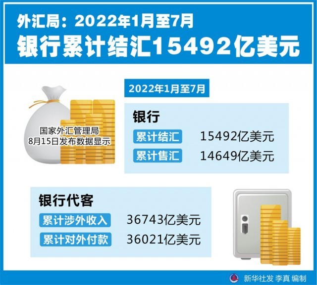 新華社北京8月15日電(記者劉開雄)國家外匯管理局15日發(fā)布數(shù)據(jù)顯示,今年1月至7月,銀行累計(jì)結(jié)匯15492億美元,累計(jì)售匯14649億美元;銀行代客累計(jì)涉外收入36743億美元,累計(jì)對(duì)外付款36021億美元。