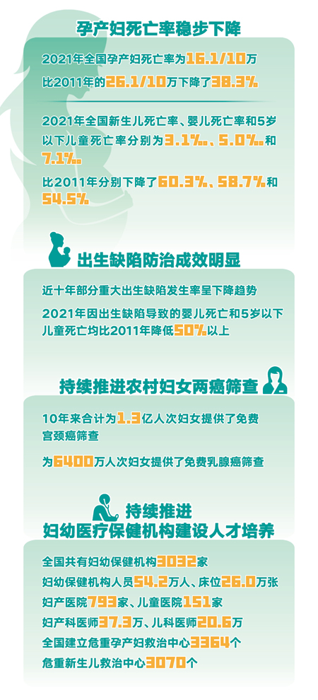 除了“兩癌”篩查,過(guò)去10年,我國(guó)婦幼健康保障水平整體取得了較大進(jìn)展。截至今年5月,全國(guó)共有婦幼保健機(jī)構(gòu)3032家,婦幼保健機(jī)構(gòu)專業(yè)人員54.2萬(wàn)人,床位數(shù)26萬(wàn)張。全國(guó)共有婦產(chǎn)醫(yī)院793家,兒童醫(yī)院151家,婦產(chǎn)科醫(yī)師37.3萬(wàn)人,我國(guó)婦幼健康服務(wù)能力得到持續(xù)提升。