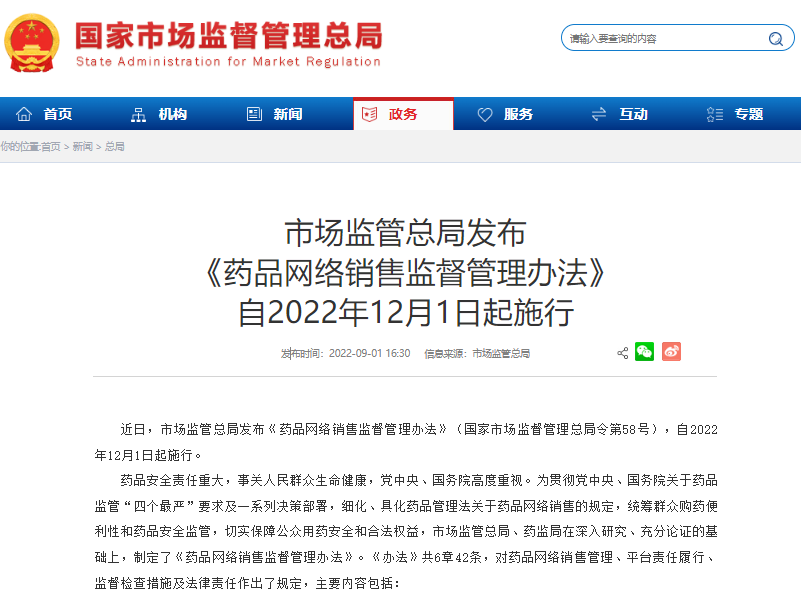 原標(biāo)題:市場(chǎng)監(jiān)管總局發(fā)布《藥品網(wǎng)絡(luò)銷(xiāo)售監(jiān)督管理辦法》 自2022年12月1日起施行