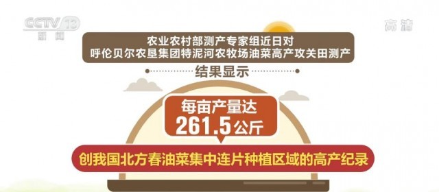 央視網(wǎng)消息:記者從內蒙古自治區(qū)農牧廳獲悉,農業(yè)農村部測產專家組近日對呼倫貝爾農墾集團特泥河農牧場油菜高產攻關田測產的結果顯示,每畝產量達261.5公斤,創(chuàng)我國北方春油菜集中連片種植區(qū)域的高產紀錄。