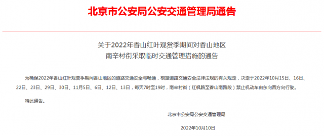 北京市交管局網(wǎng)站發(fā)布通告,為確保今年香山紅葉觀賞季期間的道路交通安全與暢通,10月15日、16日、22日、23日、29日、30日、11月5日、6日、12日、13日,每天7時(shí)至19時(shí),南辛村街(紅楓路至香山南路段)禁止機(jī)動車由東向西方向行駛。