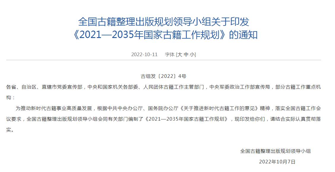 根據(jù)規(guī)劃,到2035年,古籍工作體制機制更加完善,標(biāo)準(zhǔn)規(guī)范體系基本健全,古籍保護、 整理研究和編輯出版成果豐碩,質(zhì)量明顯提升,古籍?dāng)?shù)字化資源建設(shè)取得重要進展, 古籍普及深入推進,人才隊伍發(fā)展壯大,古籍工作在傳承和弘揚中華優(yōu)秀傳統(tǒng)文化中的作用更加突出。
