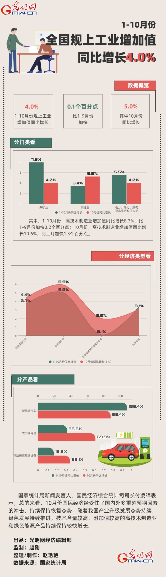 數(shù)據(jù)顯示,1-10月份,全國規(guī)模以上工業(yè)增加值同比增長4.0%,比1-9月份加快0.1個百分點。分三大門類看,采礦業(yè)增加值同比增長7.9%,制造業(yè)增長3.4%,電力、熱力、燃氣及水生產(chǎn)和供應(yīng)業(yè)增長5.5%。高技術(shù)制造業(yè)增加值同比增長8.7%,比1-9月份加快0.2個百分點。分經(jīng)濟類型看,國有控股企業(yè)增加值同比增長3.7%;股份制企業(yè)增長5.0%,外商及港澳臺商投資企業(yè)增長0.1%;私營企業(yè)增長3.4%。分產(chǎn)品看,新能源汽車、太陽能電池、移動通信基站設(shè)備等綠色智能產(chǎn)品產(chǎn)量同比分別增長108.4%、35.6%、19.3%。