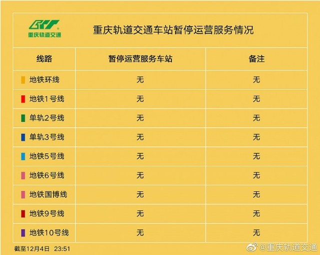 央視網(wǎng)消息:據(jù)@重慶軌道交通,12月5日06:30起,暫停運(yùn)營(yíng)服務(wù)的車站全部恢復(fù)運(yùn)營(yíng)服務(wù)。