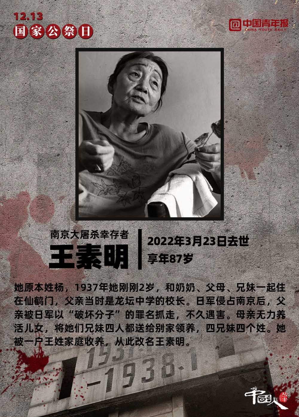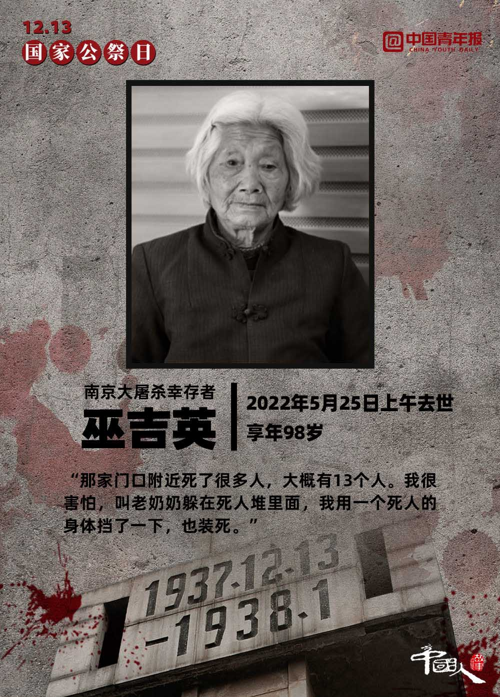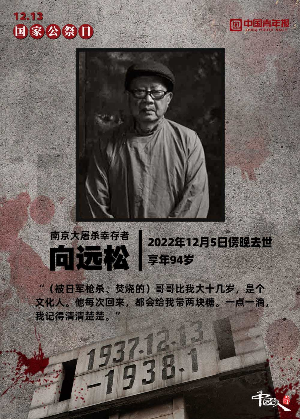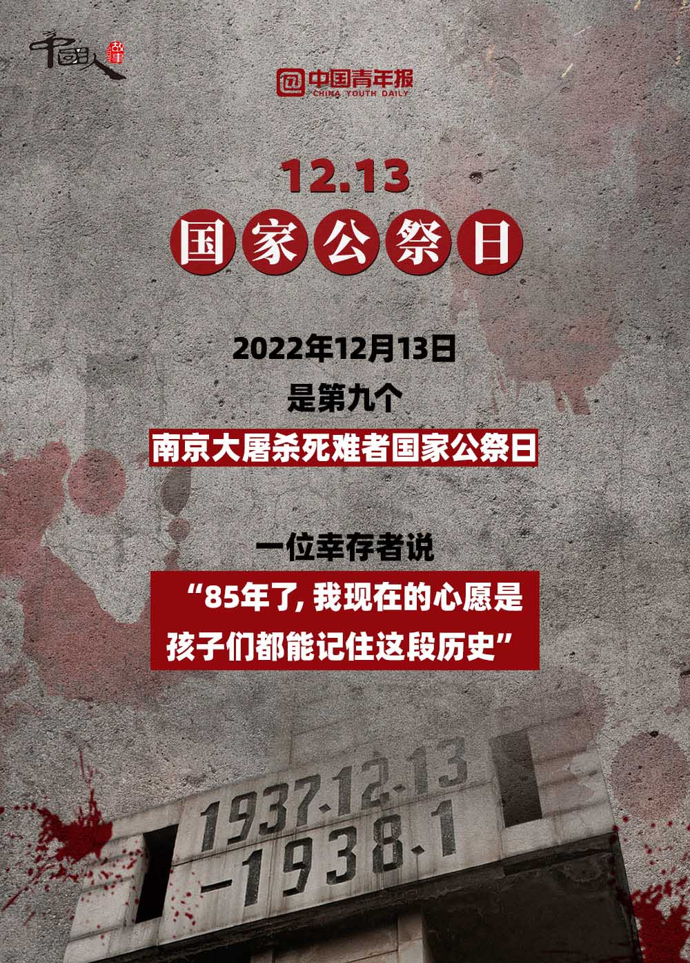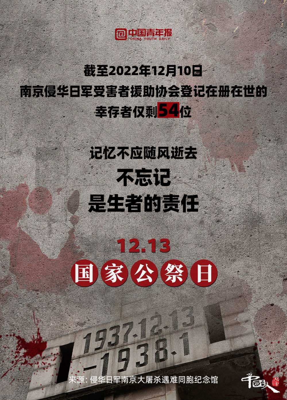 12月13日,是第九個南京大屠殺死難者國家公祭日 。截至2022年12月12日,南京侵華日軍受害者援助協(xié)會登記在冊在世的幸存者僅剩54位。一位南京大屠殺幸存者說:“85年了,我現在的心愿是孩子們都能記住這段歷史?!弊屛覀儗⑦@段歷史銘刻在內心深處,讓“記住”化作一種責任,伴著我們堅定前行。