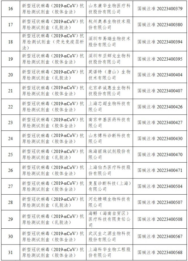 12月22日,經(jīng)國(guó)家藥監(jiān)局審查,批準(zhǔn)艾維可生物科技有限公司和邁克生物股份有限公司的2個(gè)新冠病毒抗原檢測(cè)試劑產(chǎn)品。截至目前,國(guó)家藥監(jiān)局已批準(zhǔn)44個(gè)新冠病毒抗原檢測(cè)試劑產(chǎn)品。