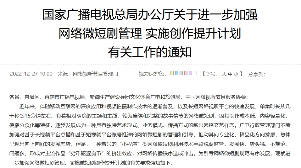 然而一種新興的“小程序”類網(wǎng)絡(luò)微短劇利用技術(shù)手段脫離監(jiān)管,發(fā)展快、勢頭猛、不規(guī)范、問題多,形成對主流作品“劣幣驅(qū)逐良幣”的擠出效應(yīng),對網(wǎng)絡(luò)傳播秩序造成沖擊。為引導(dǎo)網(wǎng)絡(luò)微短劇規(guī)范有序發(fā)展,廣電總局此次就進(jìn)一步加強(qiáng)網(wǎng)絡(luò)微短劇管理、實(shí)施微短劇創(chuàng)作提升計(jì)劃發(fā)布一系列具體措施。