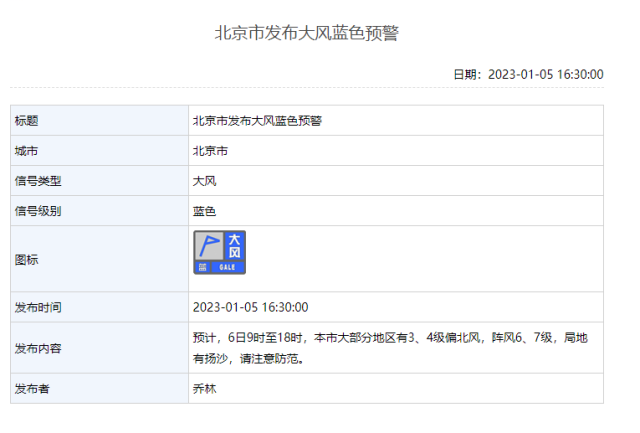央視網(wǎng)消息:據(jù)北京氣象局網(wǎng)站消息,2023年01月05日16時30分,北京市氣象臺發(fā)布大風(fēng)藍(lán)色預(yù)警。