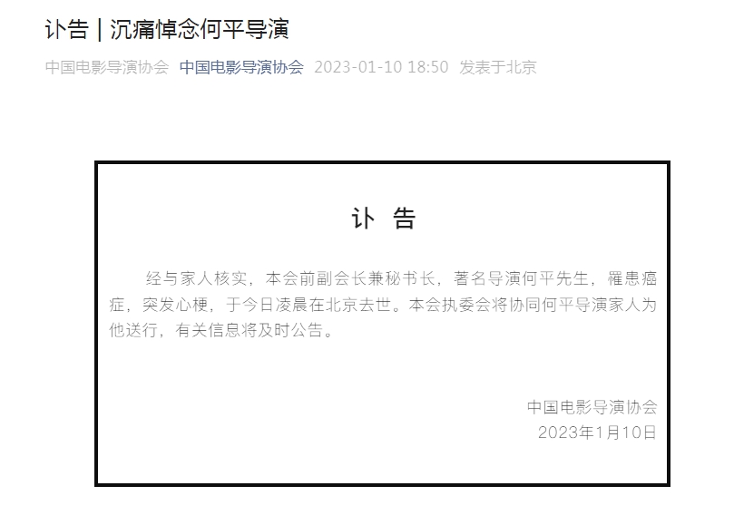 中新網(wǎng)1月10日電 據(jù)中國(guó)電影導(dǎo)演協(xié)會(huì)消息,經(jīng)與家人核實(shí),中國(guó)電影導(dǎo)演協(xié)會(huì)前副會(huì)長(zhǎng)兼秘書長(zhǎng),著名導(dǎo)演何平先生,罹患癌癥,突發(fā)心梗,于1月10日凌晨在北京去世。中國(guó)電影導(dǎo)演協(xié)會(huì)執(zhí)委會(huì)將協(xié)同何平導(dǎo)演家人為他送行,有關(guān)信息將及時(shí)公告。