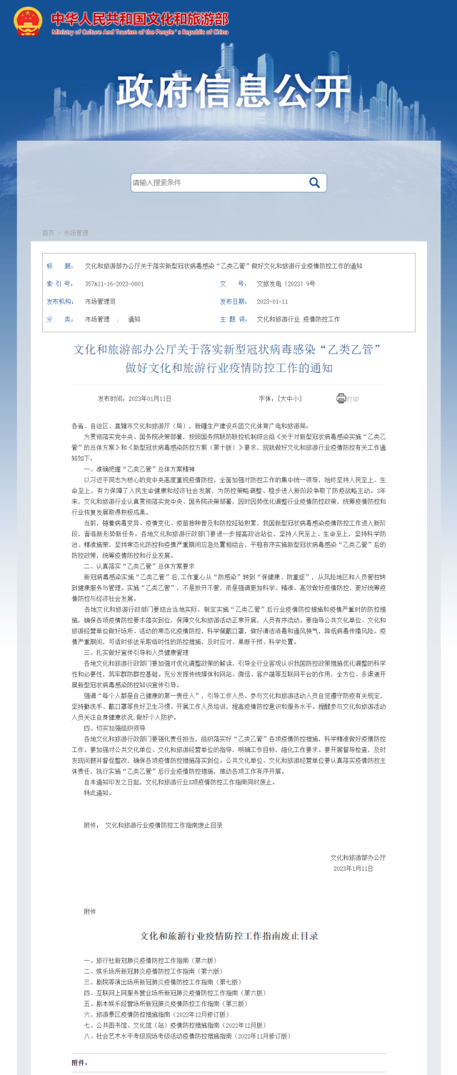 自本通知印發(fā)之日起,文化和旅游行業(yè)8項疫情防控工作指南同時廢止。