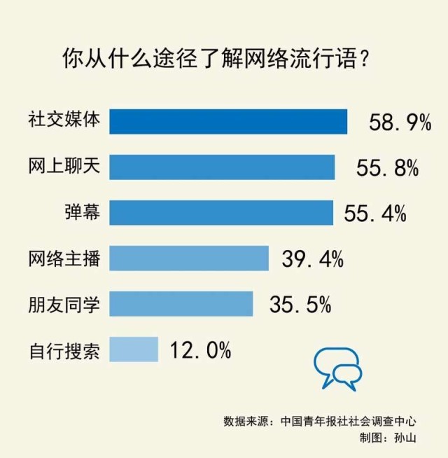 數(shù)據(jù)顯示,微博、小紅書、微信等社交媒體(58.9%)是受訪青年知曉網(wǎng)絡(luò)流行語的主要途徑。接下來是網(wǎng)上聊天(55.8%)、彈幕(55.4%)。其他還有:網(wǎng)絡(luò)主播(39.4%)、朋友同學(35.5%)和自行搜索(12.0%)等。