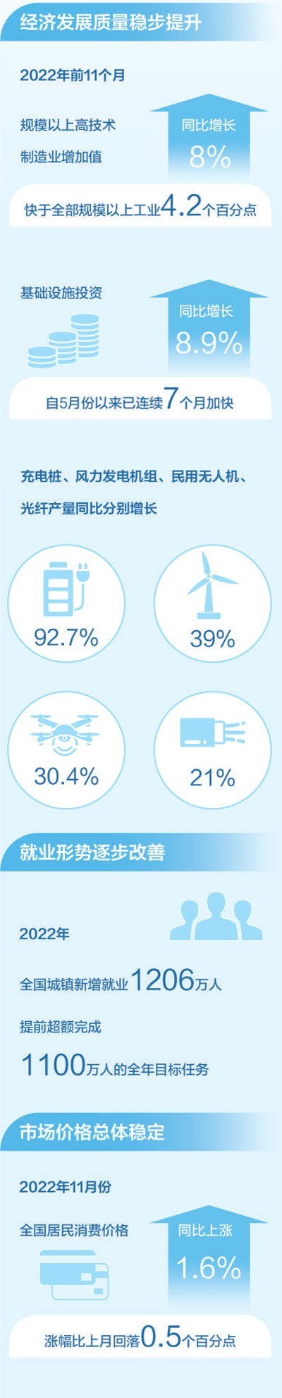 2022年,面對風(fēng)高浪急的國際環(huán)境和艱巨繁重的國內(nèi)改革發(fā)展穩(wěn)定任務(wù),我國經(jīng)濟穩(wěn)健發(fā)展,全年國內(nèi)生產(chǎn)總值預(yù)計超過120萬億元??垂┙o結(jié)構(gòu),產(chǎn)業(yè)升級發(fā)展持續(xù),新動能積蓄增強。2022年前11個月,規(guī)模以上高技術(shù)制造業(yè)增加值同比增長8%,快于全部規(guī)模以上工業(yè)4.2個百分點;看消費需求,線上消費需求釋放帶動作用明顯。前11個月,全國實物商品網(wǎng)上零售額同比增長6.4%,網(wǎng)絡(luò)購物帶動快遞等行業(yè)較快增長。