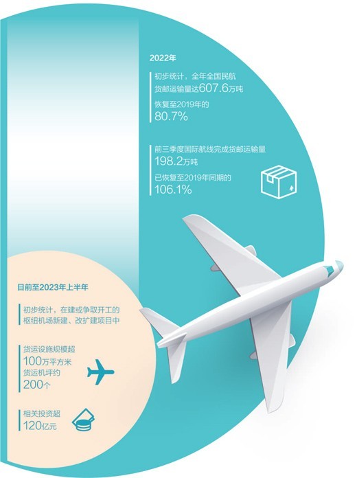 民航局有關(guān)負(fù)責(zé)人介紹,過(guò)去5年,航空貨運(yùn)基礎(chǔ)設(shè)施建設(shè)取得積極進(jìn)展,新增航空貨運(yùn)能力600萬(wàn)噸以上。下一步,將加強(qiáng)航空貨運(yùn)設(shè)施規(guī)劃建設(shè)指導(dǎo),初步統(tǒng)計(jì),目前至2023年上半年在建或爭(zhēng)取開(kāi)工的樞紐機(jī)場(chǎng)新建、改擴(kuò)建項(xiàng)目中,貨運(yùn)設(shè)施規(guī)模已超過(guò)100萬(wàn)平方米、貨運(yùn)機(jī)坪約200個(gè),相關(guān)投資超過(guò)120億元。