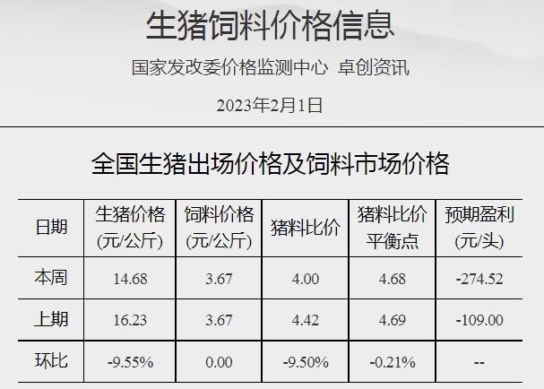 中新網(wǎng)2月6日電 據(jù)國(guó)家發(fā)改委價(jià)格監(jiān)測(cè)中心網(wǎng)站消息,截至2023年2月1日當(dāng)周,全國(guó)豬料比價(jià)為4.00,較春節(jié)前(1月18日)下降9.50%。按目前價(jià)格及成本推算,未來(lái)生豬養(yǎng)殖頭均虧損為274.52元。當(dāng)周?chē)?guó)內(nèi)豬價(jià)以降為主。隨著春節(jié)假期收尾,終端消費(fèi)漸顯疲軟,屠宰企業(yè)開(kāi)工率低位調(diào)整,整體收購(gòu)難度不大,壓價(jià)情緒較濃,而養(yǎng)殖端雖有抗價(jià)情緒,但生豬出欄壓力仍存,周內(nèi)豬價(jià)小幅走低。