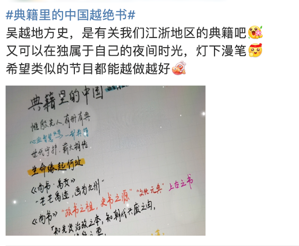 導演組回應,其實一開始沒想過“典籍宇宙”,是網(wǎng)友們看到之后的自發(fā)感受,節(jié)目初心是用更豐富的方式,呈現(xiàn)相關的典籍,解決“書是什么書,書好在哪里;人是什么人,人好在哪里”的問題。不過在未來,“典籍宇宙”還有可能繼續(xù)聯(lián)動,用更專項的內容、更廣闊的維度、更豐富多元的表達,用書中先賢的精神和事跡,推動古今情緒的同頻共振,讓克己自勵、以民為本、躬行仁義等先賢所頌揚的精神,在千年后依然熠熠生輝。