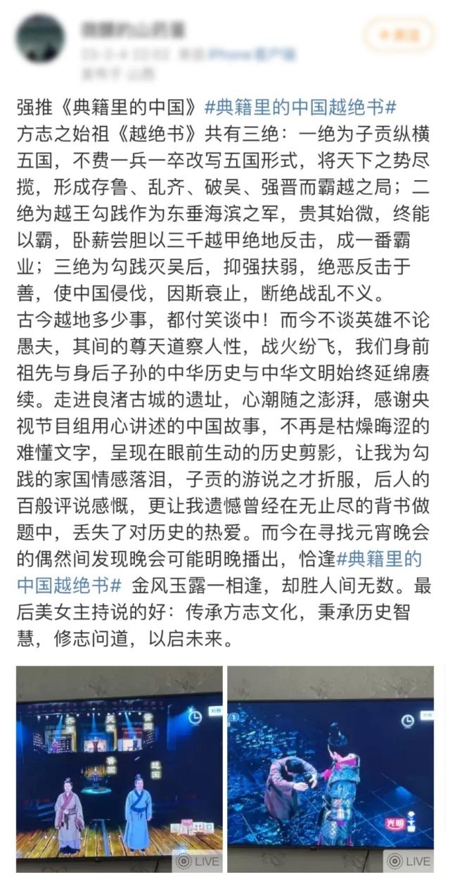 果然不負眾人所盼,第二季甫一開播,收視和好評率完美沿襲了第一季的高起點。而2月4日開播的《越絕書》,更是以史詩電影大片的精美和氣勢,將吳越爭霸驚心動魄的歷史經(jīng)典,精彩呈現(xiàn)于熒屏。第五期播出前后,9次登上熱搜熱榜,累計覆蓋微博用戶超2.6億人次;第二季豆瓣開分9.0,全平臺播放量近9億次,#典籍里的中國#主話題閱讀量累計達18.1億。