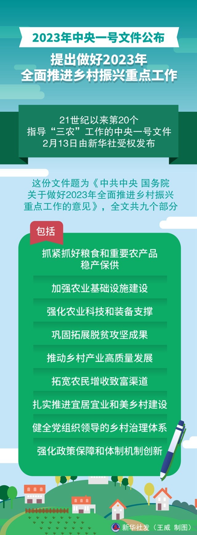 這份文件題為《中共中央 國務院關于做好2023年全面推進鄉(xiāng)村振興重點工作的意見》,全文共九個部分,包括:抓緊抓好糧食和重要農產品穩(wěn)產保供、加強農業(yè)基礎設施建設、強化農業(yè)科技和裝備支撐、鞏固拓展脫貧攻堅成果、推動鄉(xiāng)村產業(yè)高質量發(fā)展、拓寬農民增收致富渠道、扎實推進宜居宜業(yè)和美鄉(xiāng)村建設、健全黨組織領導的鄉(xiāng)村治理體系、強化政策保障和體制機制創(chuàng)新。