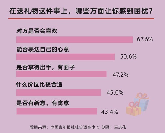中國青年報社社會調(diào)查中心的調(diào)查顯示,在送禮物上,69.9%的受訪青年感到有困擾,且男生有困擾的比例高于女生,這也從一定程度上反映出男生在禮物選擇和情感表達上更為糾結(jié)。