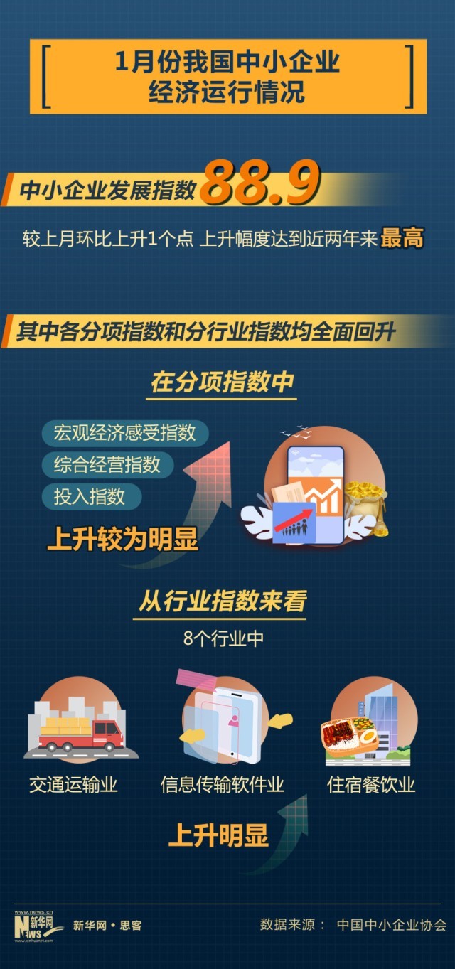 近日中國中小企業(yè)協(xié)會公布我國中小企業(yè)經(jīng)濟運行情況。2023年1月份,中國中小企業(yè)發(fā)展指數(shù)為88.9,比去年12月回升1個點,上升幅度達到近兩年來最高。其中,企業(yè)發(fā)展信心回升,反映企業(yè)信心狀況的宏觀經(jīng)濟感受指數(shù)為98.7,比上月上升2.1點。市場預(yù)期有所提振,市場指數(shù)為80.7,環(huán)比上升0.9點。