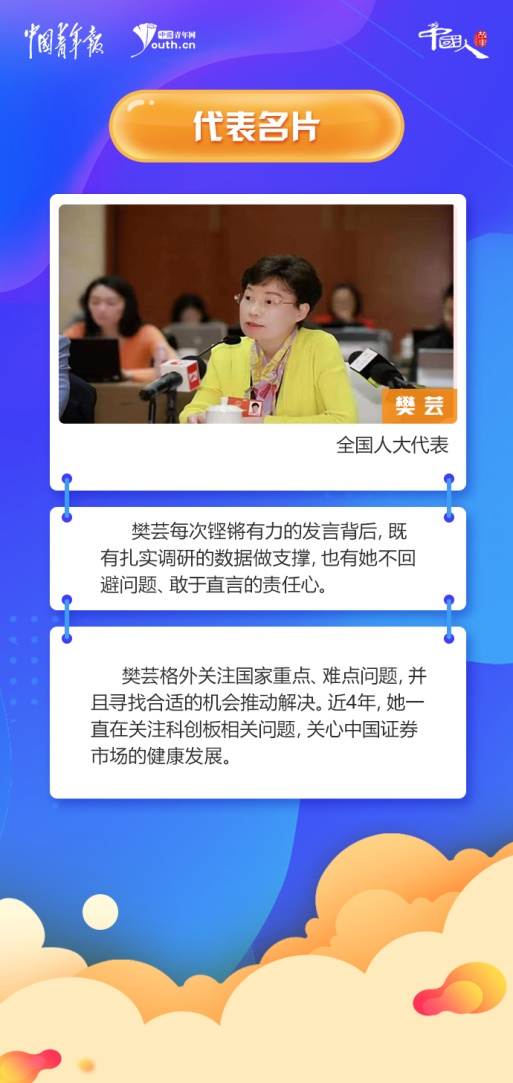 樊蕓格外關注國家重點、難點問題,并且尋找合適的機會推動解決。近4年,她一直在關注科創(chuàng)板相關問題,關心中國證券市場的健康發(fā)展。