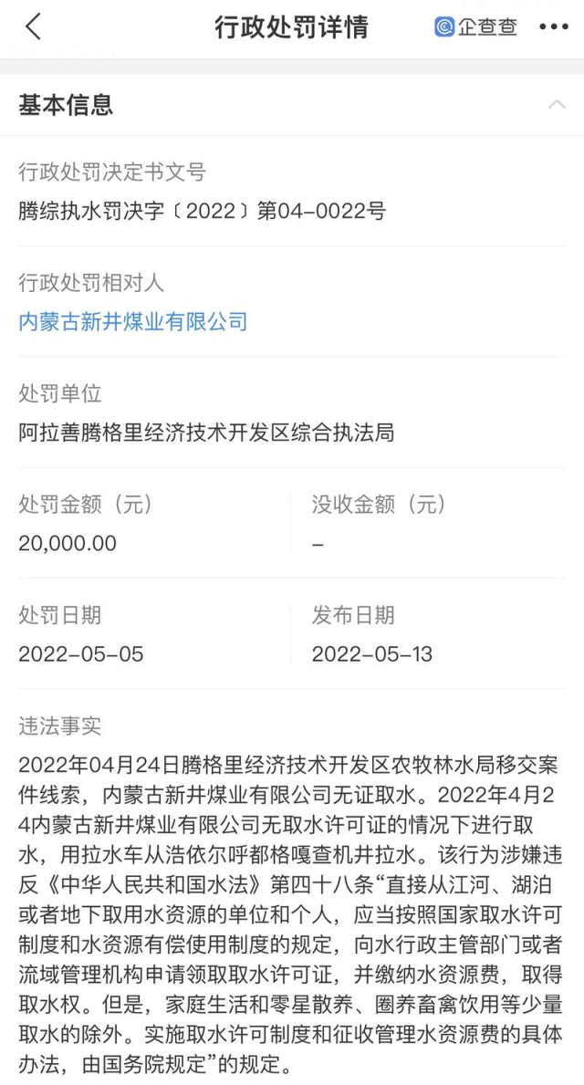 2022年該公司欠繳資源稅800多萬元、增值稅200多萬元,還因無取水許可證的情況下取水,被阿拉善騰格里經(jīng)濟(jì)技術(shù)開發(fā)區(qū)綜合執(zhí)法局行政處罰2萬元。