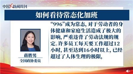 全國政協委員、編劇蔣勝男建議加強勞動法對勞動者的休息權保護,對企事業(yè)單位八小時工作制的執(zhí)行情況加強監(jiān)督管理。