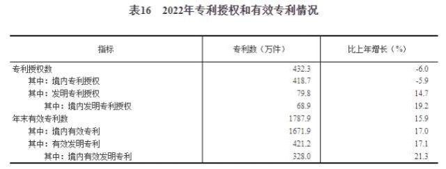 全年授予專利權(quán)432.3萬件,比上年下降6.0%;PCT專利申請受理量7.4萬件。截至年末,有效專利1787.9萬件,其中境內(nèi)有效發(fā)明專利328.0萬件。每萬人口高價值發(fā)明專利擁有量9.4件。全年商標(biāo)注冊617.7萬件,比上年下降20.2%。全年共簽訂技術(shù)合同77萬項,技術(shù)合同成交金額47791億元,比上年增長28.2%。我國公民具備科學(xué)素質(zhì)的比例達(dá)到12.93%。