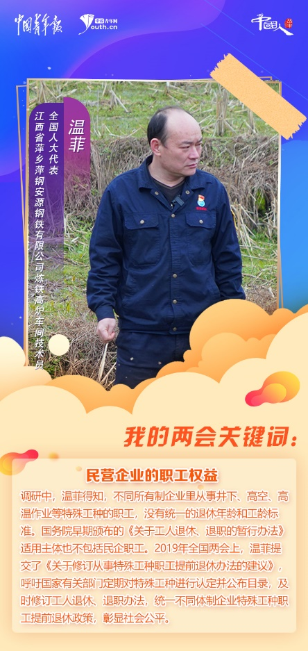 民營(yíng)企業(yè)的職工權(quán)益,一直是溫菲關(guān)注的焦點(diǎn)。調(diào)研中,溫菲得知,不同所有制企業(yè)里從事井下、高空、高溫作業(yè)等特殊工種的職工,沒(méi)有統(tǒng)一的退休年齡和工齡標(biāo)準(zhǔn)。國(guó)務(wù)院早期頒布的《關(guān)于工人退休、退職的暫行辦法》適用主體也不包括民企職工。2019年全國(guó)兩會(huì)上,溫菲提交了《關(guān)于修訂從事特殊工種職工提前退休辦法的建議》,呼吁國(guó)家有關(guān)部門定期對(duì)特殊工種進(jìn)行認(rèn)定并公布目錄,及時(shí)修訂工人退休、退職辦法,統(tǒng)一不同體制企業(yè)特殊工種職工提前退休政策,彰顯社會(huì)公平。