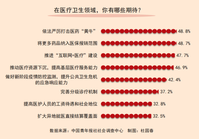 在全國兩會召開前夕,中國青年報(bào)社社會調(diào)查中心聯(lián)合問卷網(wǎng)(wenjuan.com),進(jìn)行了一項(xiàng)題為“兩會在即,你最關(guān)心哪些議題”的全國兩會青年期待調(diào)查,共有2201人參與。調(diào)查顯示,在醫(yī)療衛(wèi)生領(lǐng)域,48.8%的受訪者期待依法嚴(yán)厲打擊醫(yī)藥“黃?!?,48.7%的受訪者期待將更多藥品納入醫(yī)保報(bào)銷范圍。