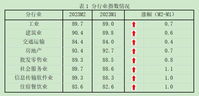 2月份,隨著經濟逐步恢復,8個行業(yè)指數均連續(xù)兩個月上升。服務業(yè)指數恢復速度領先,其中,社會服務業(yè)、信息傳輸計算機服務軟件業(yè)、住宿餐飲業(yè)和批發(fā)零售業(yè)指數分別上升1.1、1.0、1.0和0.8點。