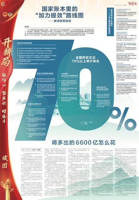 3月7日,《中國青年報》兩會特刊推出可視化版面解讀預(yù)算報告中的重要數(shù)據(jù)“70%”——連續(xù)5年全國財(cái)政支出70%以上用于民生。通過突出這一大數(shù)據(jù),凸顯本屆政府執(zhí)政為民的理念。整版通過數(shù)據(jù)的變化,解讀預(yù)算報告,呈現(xiàn)“積極財(cái)政政策提力增效的路線圖”。