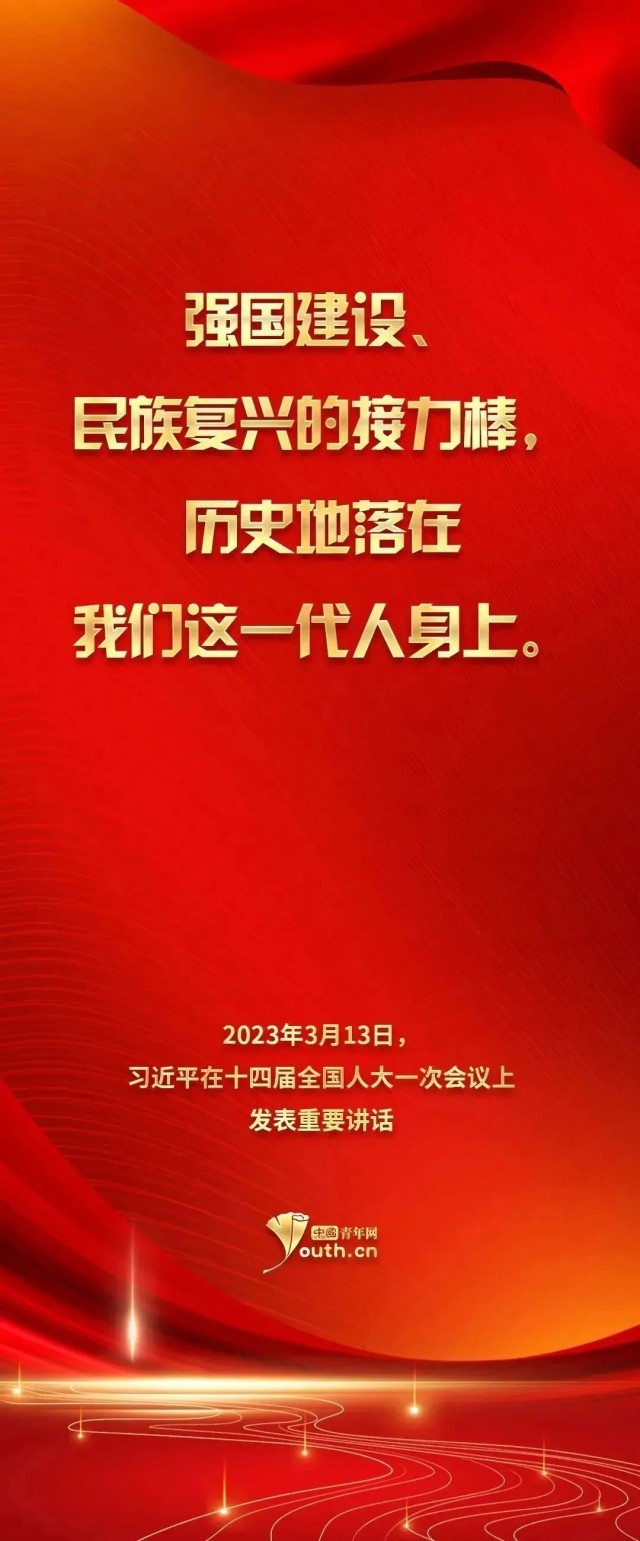 主講人:青年朋友們大家好,我是來自東北林業(yè)大學(xué)馬克思主義學(xué)院的于冰。3月13日,習(xí)近平主席在十四屆全國人大一次會議上發(fā)表重要講話指出,強(qiáng)國建設(shè)、民族復(fù)興的接力棒,歷史地落在我們這一代人身上。我們今天圍繞這一主題展開學(xué)習(xí)。首先,咱們來學(xué)習(xí)體悟習(xí)主席講話中的一些金句。