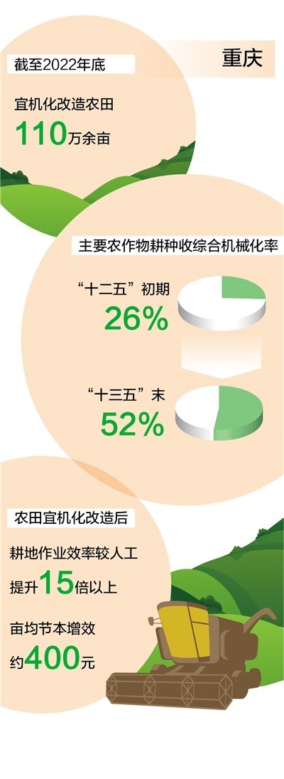 2015年起,重慶著眼于提升農(nóng)業(yè)機(jī)械化水平,探索推進(jìn)丘陵山區(qū)農(nóng)田宜機(jī)化改造。截至2022年底,重慶已對110萬余畝農(nóng)田進(jìn)行了宜機(jī)化改造,主要農(nóng)作物耕種收綜合機(jī)械化率由“十二五”初期的26%提高到“十三五”末的52%。