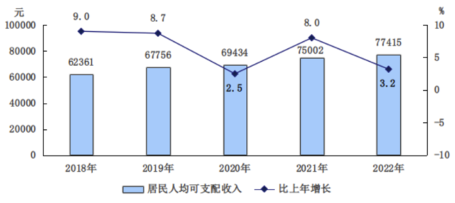 全年全市居民人均可支配收入為77415元,比上年增長3.2%,扣除價格因素,實(shí)際增長1.4%。