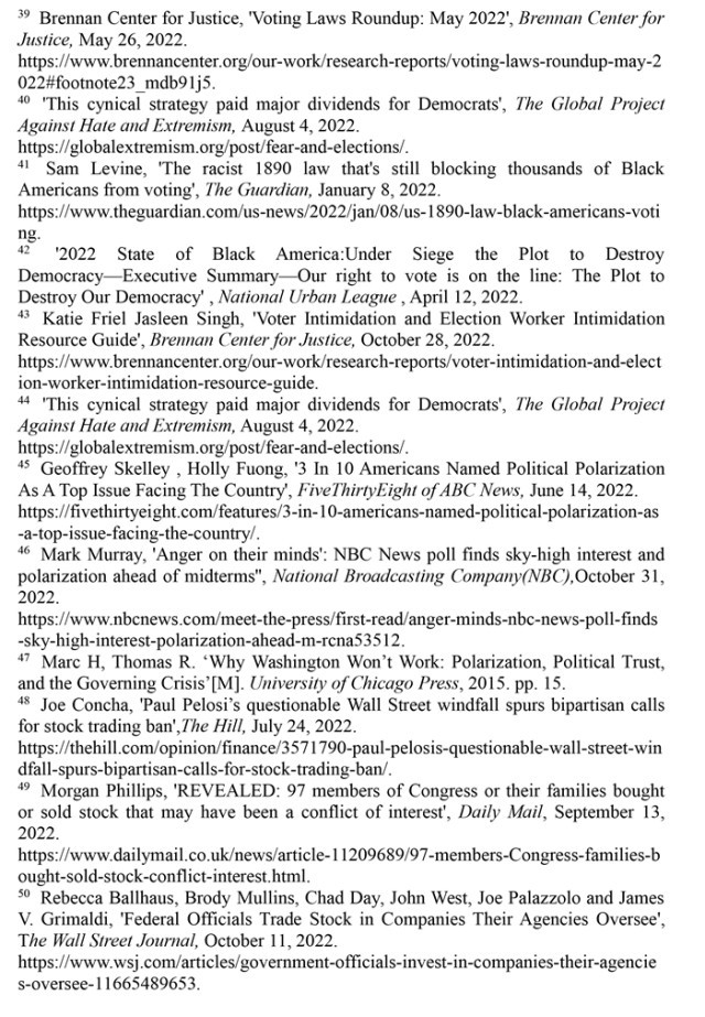 中期選舉成為最昂貴的選舉,美式民主失去民意基礎(chǔ)。美國的選舉費(fèi)用一再飆升,2022年中期選舉累計(jì)花費(fèi)超過167億美元。億萬富翁的政治獻(xiàn)金占所有聯(lián)邦政治項(xiàng)目獻(xiàn)金的15%,遠(yuǎn)高于2020年選舉周期的11%?!昂诮稹本栀?zèng)暗中操控選舉走向,政治極化和社會(huì)撕裂導(dǎo)致民主共識難以達(dá)成。69%的美國人認(rèn)為美國民主面臨“崩潰風(fēng)險(xiǎn)”,86%的美國選民表示美國民主面臨“非常嚴(yán)重的威脅”,人們對美式民主普遍感到絕望。
