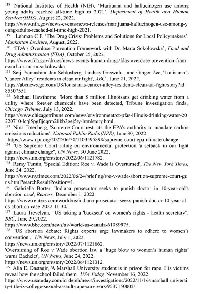 治理缺位危害環(huán)境權(quán)。美國廣播公司2022年6月21日報(bào)道,在路易斯安那州,大量排放的工業(yè)廢料致使密西西比河沿岸出現(xiàn)諸多“癌癥巷”地區(qū),該地區(qū)民眾因空氣污染而患癌的風(fēng)險(xiǎn)較美國其他地區(qū)高出95%。(注121)《芝加哥論壇報(bào)》2022年7月13日報(bào)道,在伊利諾伊州,占當(dāng)?shù)厝丝诩s60%的逾800萬居民的飲用水中,檢測到至少含一種可能有損健康的“永久性化學(xué)物質(zhì)”。(注122)在環(huán)境形勢日趨惡化的背景下,美國聯(lián)邦最高法院卻于2022年6月裁定,美國環(huán)境保護(hù)局無權(quán)在未得到美國國會(huì)授權(quán)的條件下,在州層面限制溫室氣體排放量,也不得要求發(fā)電廠放棄化石燃料轉(zhuǎn)用可再生能源。(注123)聯(lián)合國秘書長發(fā)言人杜加里克指出,美國聯(lián)邦最高法院的這一裁決,是“全球應(yīng)對氣候變化的一次挫折”。(注124)